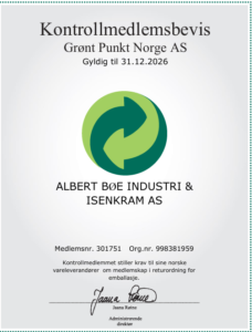 Albert Bøe Industri & Isenkram as er medlem av Grønt Punkt Norge og tar ansvar for alle emballasjetyper gjennom retursystemer godkjent av Miljødirektoratet.